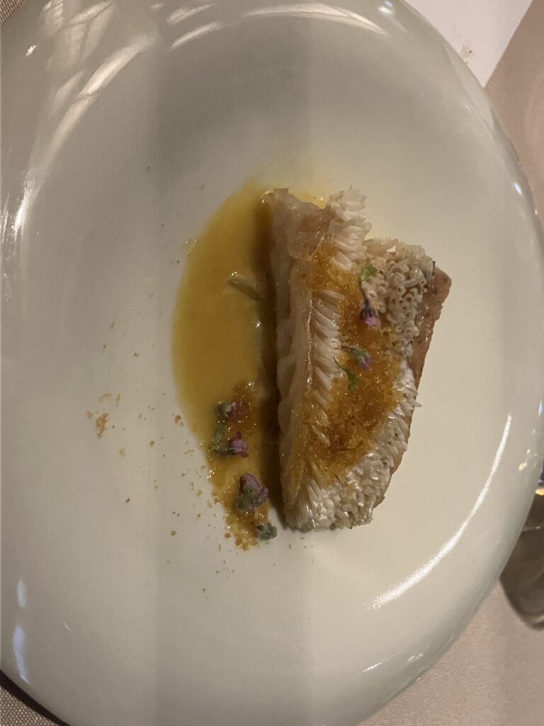 甘鯛自体は食べたことがあるのに、初めて味わうようなおいしさ。そして焼き加減、表面がパリパリで中がふわふわという食感のすばらしさ、身のほどけ具合、ともに神の領域といった素晴らしさで、この後に出てきたサーロインステーキがかすむほどの味わいでした。