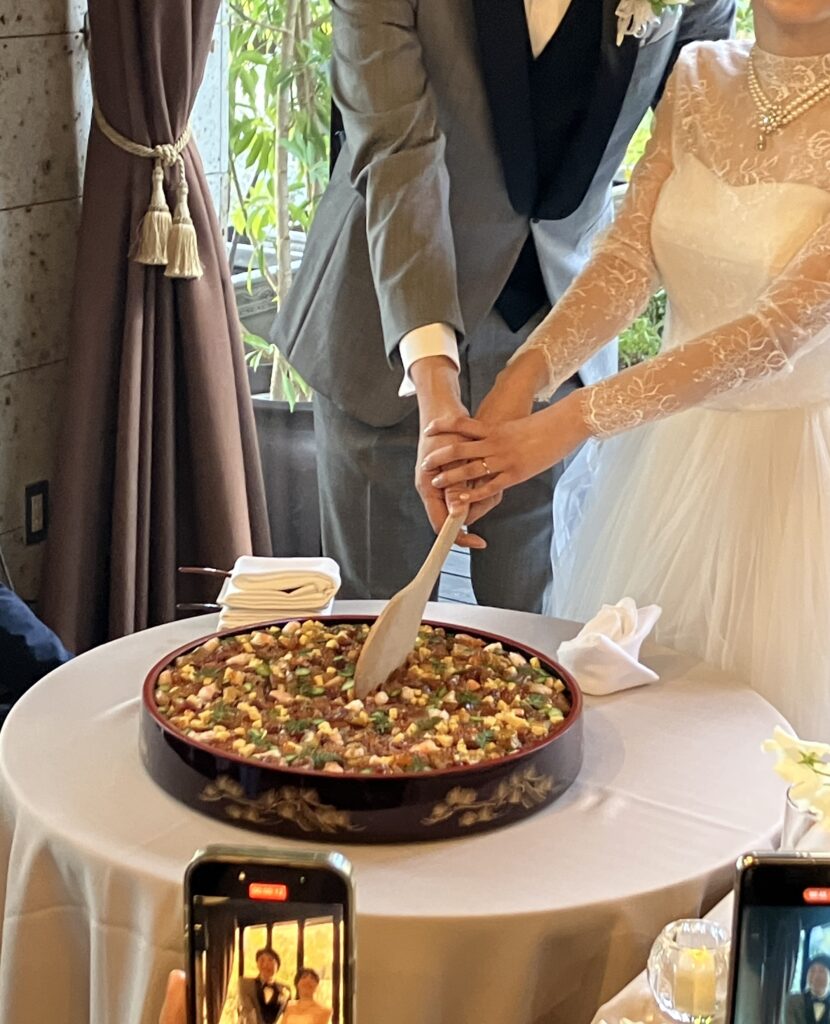 ケーキ入刀ならぬ、ちらしずし入刀。新鮮な魚介類と、ひつまぶしのコラボみたいな豪華でぜいたくなビジュアル。この後、参列者にふるまわれました。